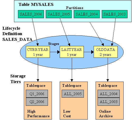 As an example, consider using the ILM Assistant to manage the table MYSALES. MYSALES contains partitions SALES_2006, SALES_2005, SALES_2004 and SALES_2003. The logical storage tiers High Performance, Low Cost, and Online Archive are defined in the ILM Assistant and each one contains one or more Oracle tablespaces. The lifecycle definition, SALES_DATA, which is used to manage the table MYSALES contains the following three stages: